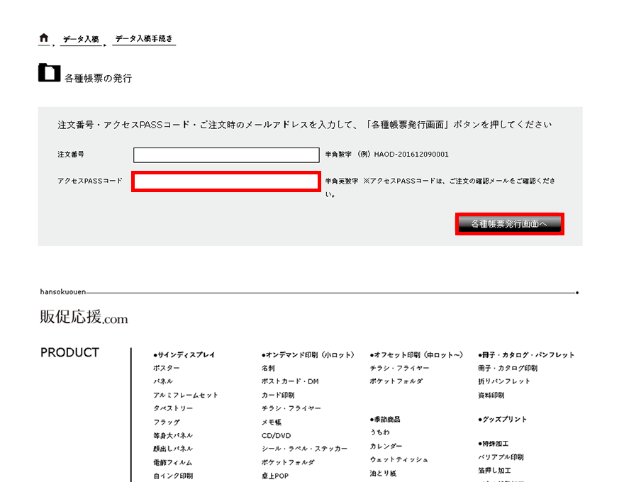 メールの下の方「●各種帳票の発行に関して」という項目のURLをクリックします。2.開いたページで注文番号とアクセスパスコード(注文控えメールの上にあります)を